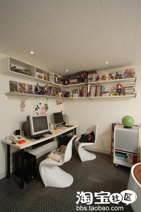这个独特的案例是为一对年轻的soho人士设计的:男主人是影视制作高手,平时喜欢收藏变形金刚、限量版的可口可乐瓶,以及各种影视海报,还是一个电子乐的爱好者兼DJ;女主人从事动漫设计工作,满墙的娃娃都是她的最爱。