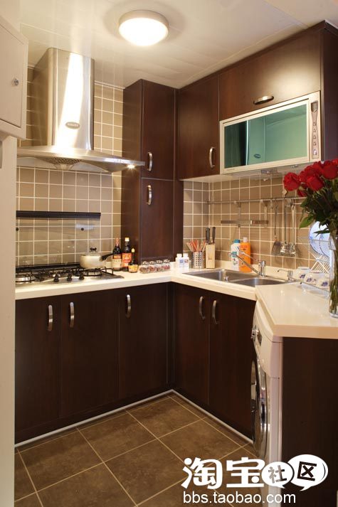 4、厨房和餐台:一组实木质感的厨柜和餐台相得益彰,彩绘玻璃门外是一个功能性的小阳台;