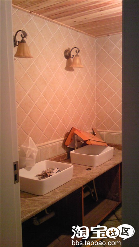 顶面是用桑拿板吊顶,和砖的颜色很搭配,不喜欢用铝的那种吊顶,不能突出田园感觉~而柜子是木匠做的,还不错~就等着装百叶门了~面盆我们用了两个,因为只有一个卫生间,所以有两个面盆要好一些,不打挤,哈哈~
