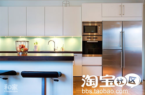 敞开式厨房的设计有吧台,有餐桌,可以看出屋主一定是小康之家。大大的窗户几乎围绕着这间厨房,让人感觉很阳光。