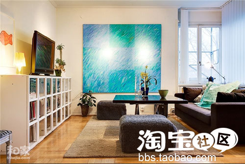 家庭房的设计感觉也很不错。一面湖蓝色的装饰画勾勒出最美的色彩。沙发、茶几、脚凳应有尽有,还有一个玻璃柜上面放电视机、下面藏书,这里真是一个家庭成员娱乐的好地方。