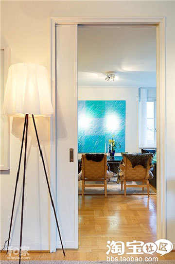 客厅的一角,一个很有设计感的落地灯倚靠在门口,美丽的灯罩,白色的灯光,为这个色彩小屋增添了很多的亮点。