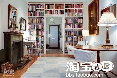 整整一面墙的书架镶嵌进墙的里面,看着满满当当的书,可以看出屋主是爱书之人。这样的设计也是很好利用空间的方法。壁炉为这个居室增添进温暖,在壁炉的旁边还有一套书桌椅可以用来读书写字。
