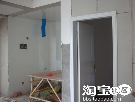本来这个户型是两房两厅的,但是妈妈建议饭厅改为一个小房间,这个建议有利有弊,最后还是这样做了,但是采光就要从厨房来了。开始动工,砌的就是饭厅隔出来的小房间,一边是墙,其便是做个柜子隔的,隔音还可以,看图吧。