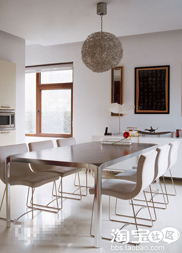 餐桌仍旧连续喜好的素色,墙上淘来的画和边柜上风趣的摆件,令整个餐厅生动起来。
