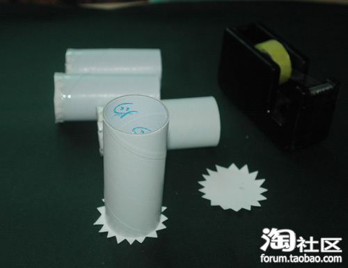1、三个高的卫生纸芯,两个稍微矮的,再加上一个胶条的纸芯。