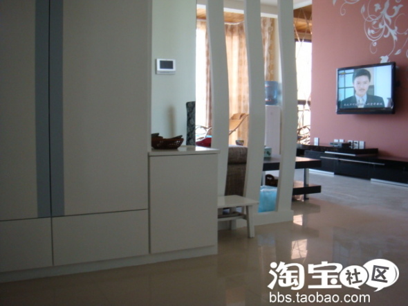 电视墙最有特点就是手绘造型了和旁边的茶镜了。而进户门鞋柜是现场制作以灰白调为主的简单色调。还有旁边的装饰隔断了 ,呵呵 这个制作起来相对比较难。