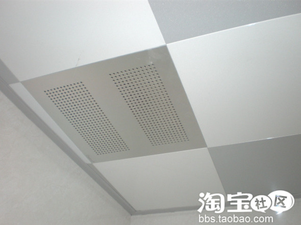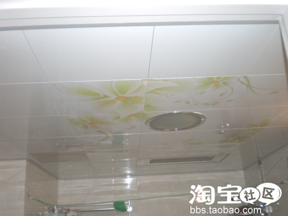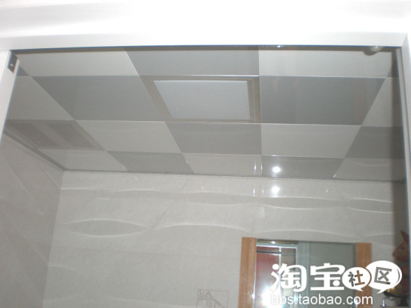 为了避免单调,选择了一整块的拼花板,这种花片像瓷砖的一样是单独买的,是10元一片,其他部位的吊顶是130一个平方,灯30*30的120一个,碳纤维取暖30*60,360一个,30*30换气扇100一个