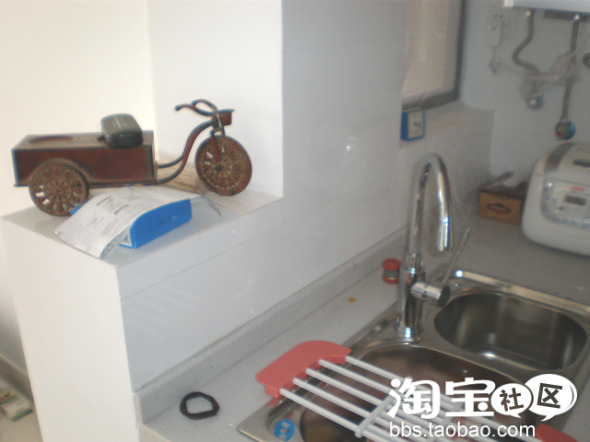 水槽前面我砌了个矮墙,目的就是能挡水还能放盆花,现在先放了个小车摆着
