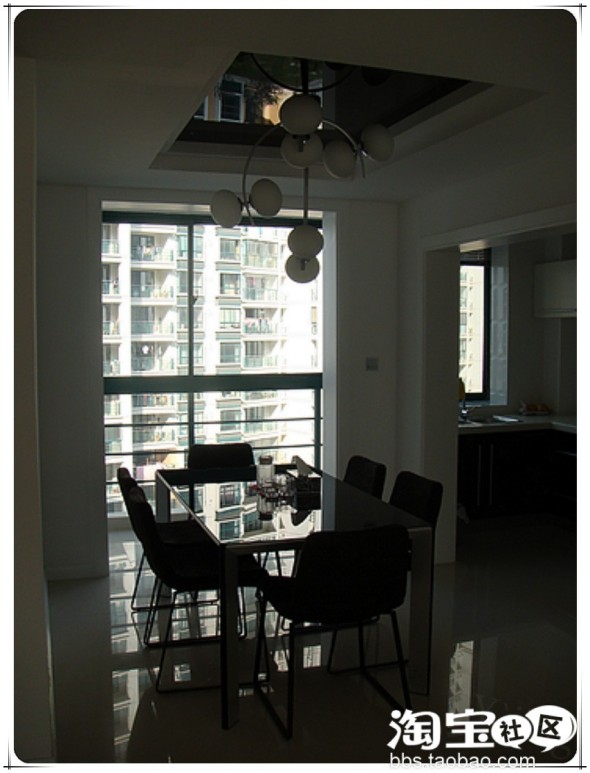 五:餐厅吊顶式是黑色钢化玻璃,里面用实心木头订的十字架,然后装上玻璃,之后把灯吊在里面的木头十字架部位,这样结实,不必担心灯会掉下来。灯在雷士照明购买。