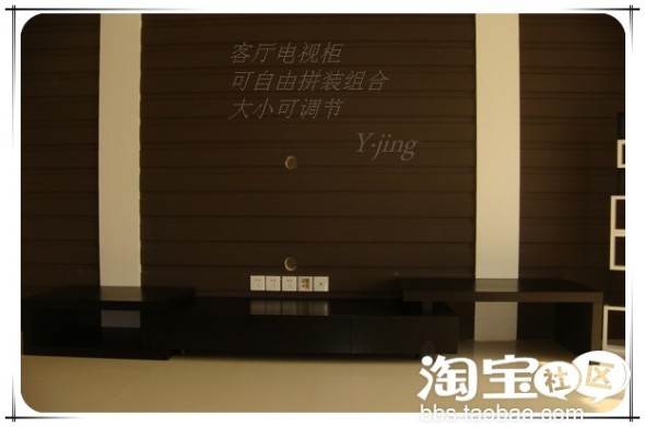 四:电视背景墙,涂料时多乐士调的颜色,咖啡色,可以用湿布打理。其实当时我们要的效果根本不是这样的,误打误撞最后成型,总体还可以吧,显得家大而且不乱,咖啡色显得家居有格调。电视柜1300元。