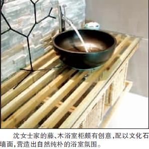 案例:主人沈女士是做美术编辑工作的,她希望家里9平方米的卫生间装修既另类特殊,又不用花太多的钱。于是,设计师进行一番合理规划后,没有采用那些昂贵的材料、洁具,只运用普通的材料,如木方条、藤框、文化石等,拼装出一个风格自然纯朴的卫浴空间。