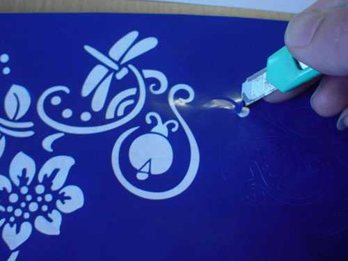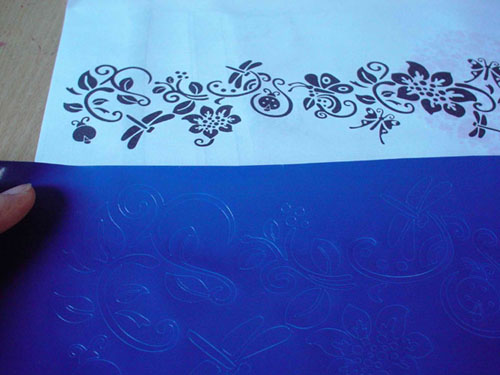 2)找个喜欢的图案,做成模板,看到下面的图了吗?上半部分白色的是打印出来的图案,下半部分蓝色的就是做好的模板了,上面有细细的刻纹;
