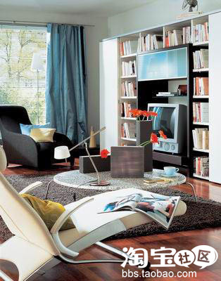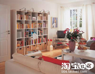 让书架成了客厅的装饰,在沙发旁放个台灯,没客的时候,客厅就是主人的大书房。