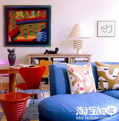 涂鸦风格的客厅,却被布置得非常整洁,多彩而不杂乱,沙发背后的小阅读桌,你信不信,周末也是主人的餐桌和喝下午茶的地方 。