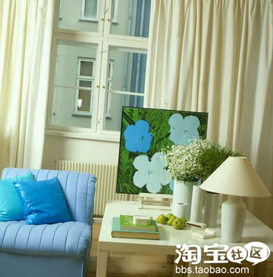 蓝白色调带来清爽海风,这位MM使用这么大副的、纯色、洁白窗帘,看来主人很大气,桌上的花花草草和装饰花,清爽中透出性格 。她在告诉我们,不需要大费周章,简单就是最好的。