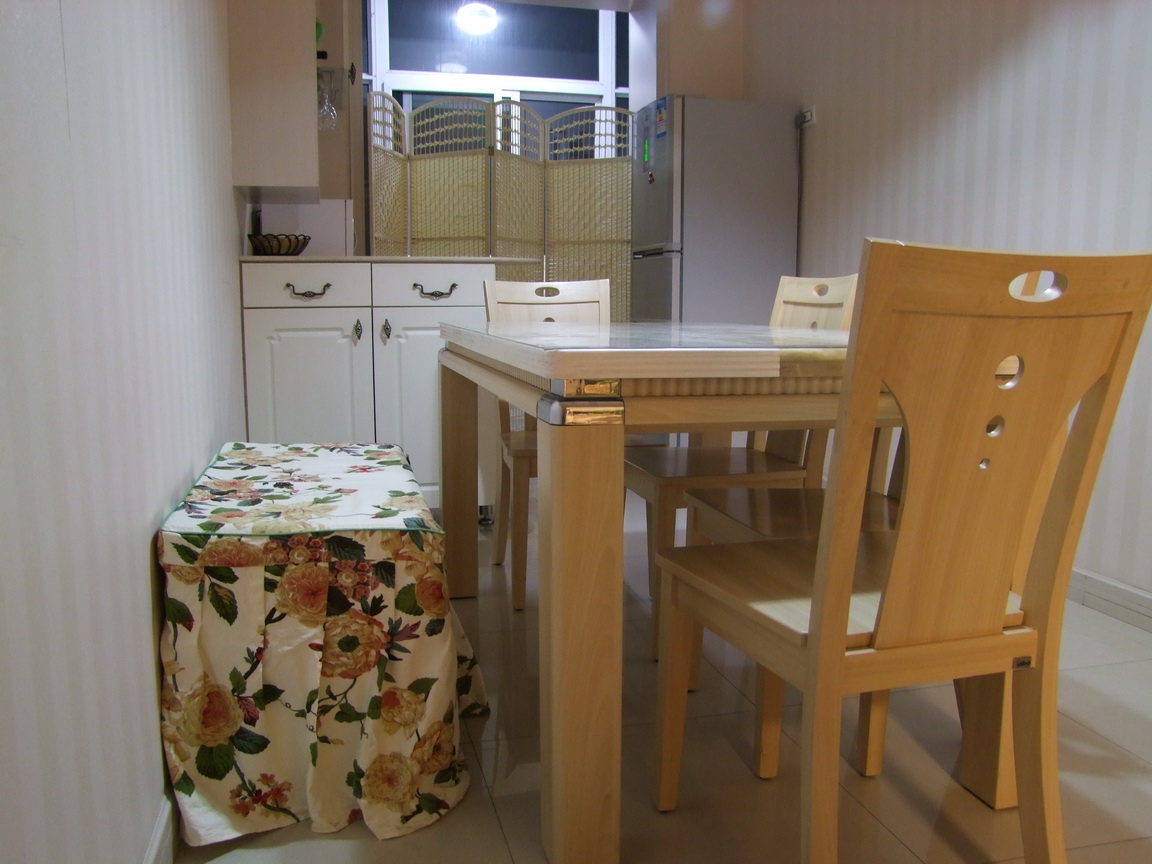 买餐桌的时候,就买了4把椅子,让工人打了个坐箱,我买了海绵,又做了一个好看的罩子。可以顶两个椅子,呵呵,揭开盖子,里面还可以储物,不错吧!