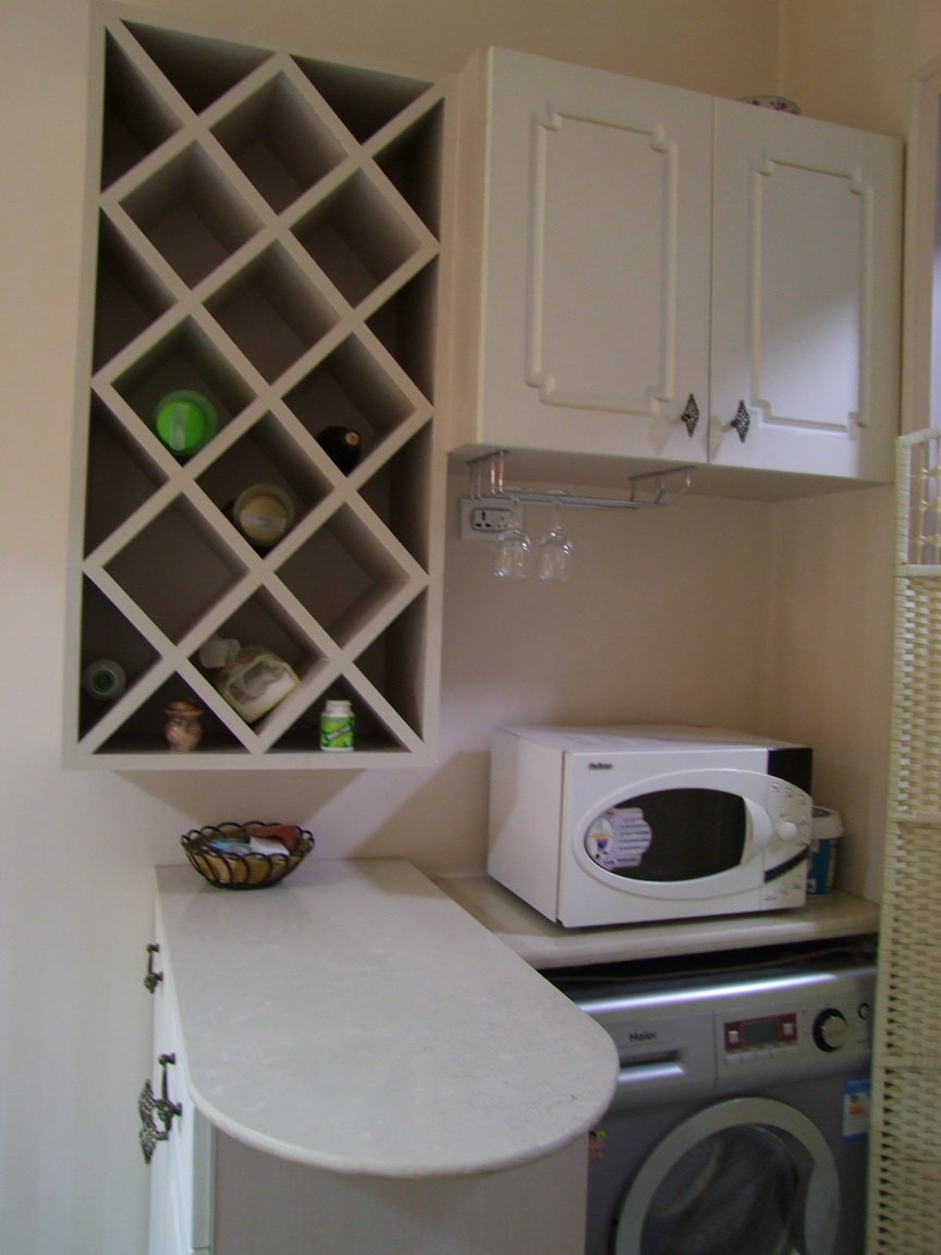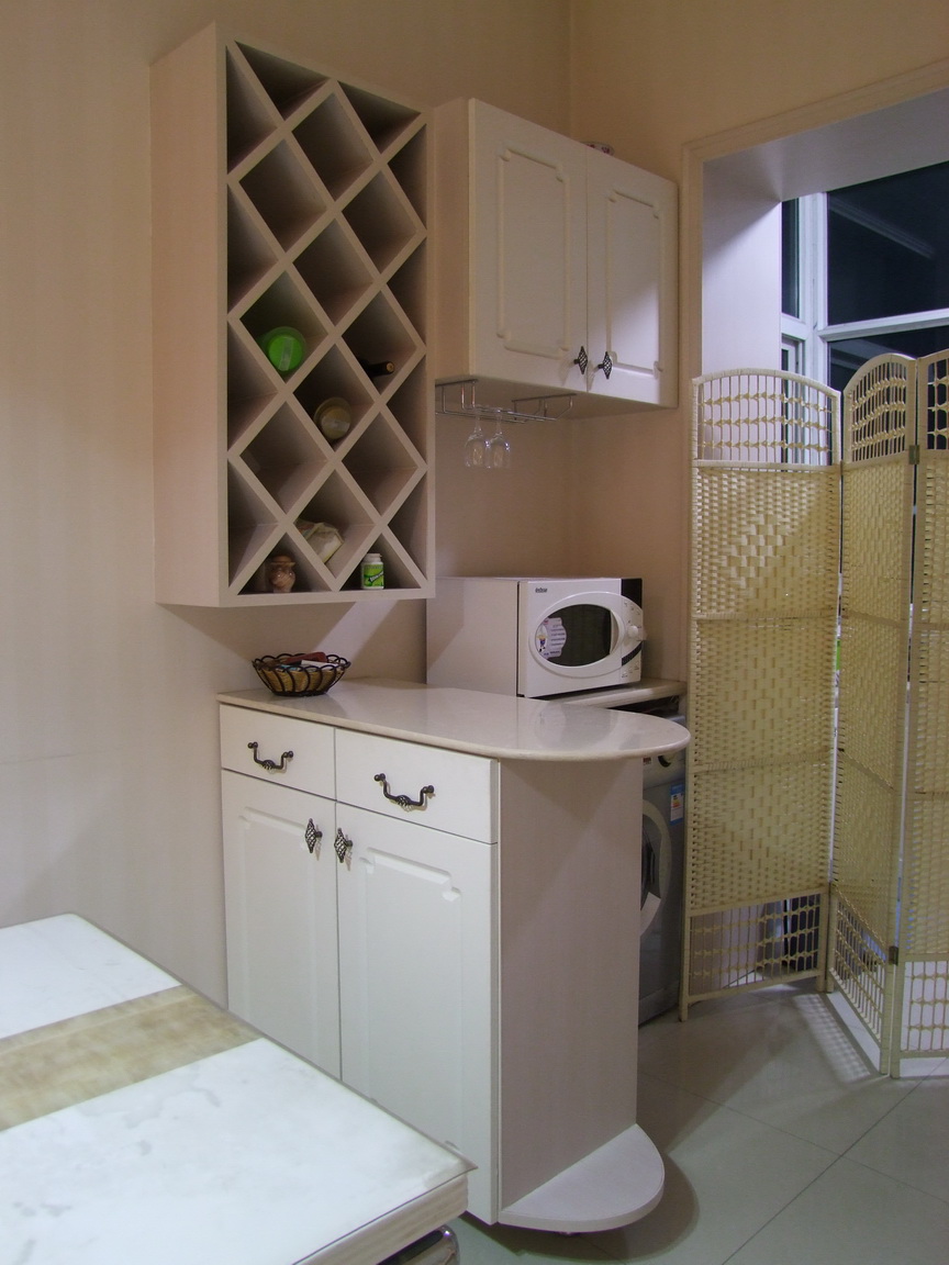 餐厅没有吊顶,只是简单地走了个石膏线。在厨房和餐厅中间,做了一个小吧台,简单的隔断,而且微波炉和洗衣机也有了自己的家,用起来比较舒服。看到那个米色的屏风了吗?也是淘宝上买的,呵呵!厨房和餐厅中间没有安门,因为怕安上门后,影响家里通透的感觉,可是,到了夏天,