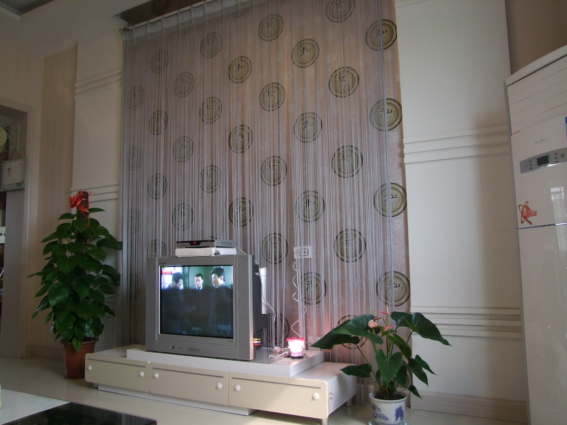 客厅不算大,但也不小,装修时,简单的吊了一下顶,安装了几个牛眼灯。电视背景墙,也没有费事,就是做了两个石膏柱子,中间贴了壁纸,并安了一个银色的线帘,虽简单,但很出效果,我称它是“一帘幽梦”。电视没有换新的,还能看,明年吧换个42的液晶!
