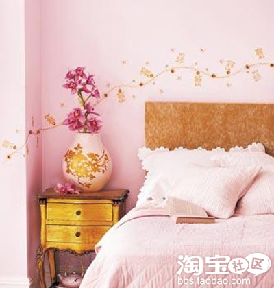 整体效果粉色系非常适合给卧室营造婉约、柔和的感觉。床品具有花边装饰,旁边的花瓶以及里面的鲜花都突出了柔美的感觉,墙面的设计非常适合居室环境。