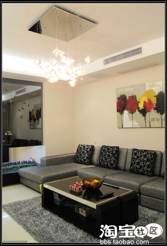 进门玄关,为了这个玄关改过N个方案,最终放弃了下面鞋柜上面花格的常规设计。倒吊的鞋柜,外包灰镜(里面打开都是放鞋的哦,哈哈哈哈~~能放很多很多很多),顺便也当了个出门的全身镜。灰镜上面的墙贴也是找了很多的造型,一颗树一直延伸到背后,两个人一个晚上贴出来的效果。还有花心思的地毯,同样的树系列,天津来的货色,蛮厚实~~