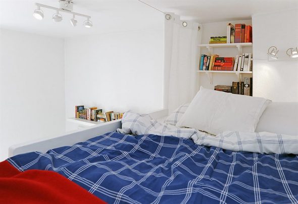 阁楼上的卧室,一点也不浪费空间,还有小小的书架