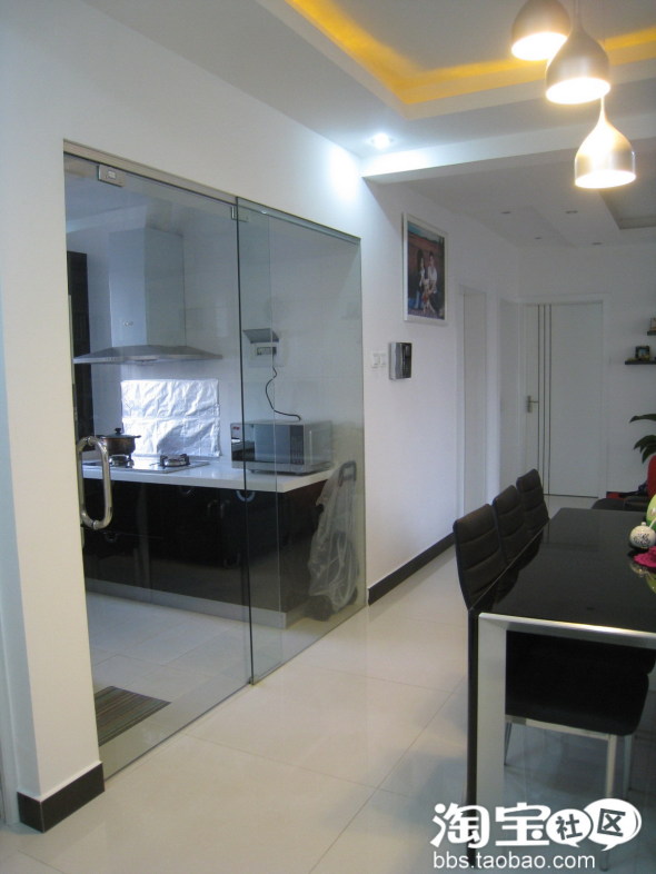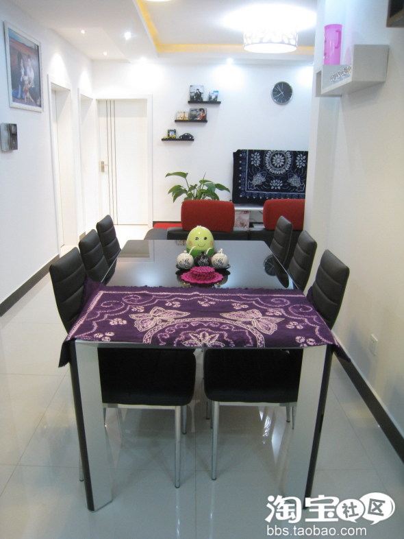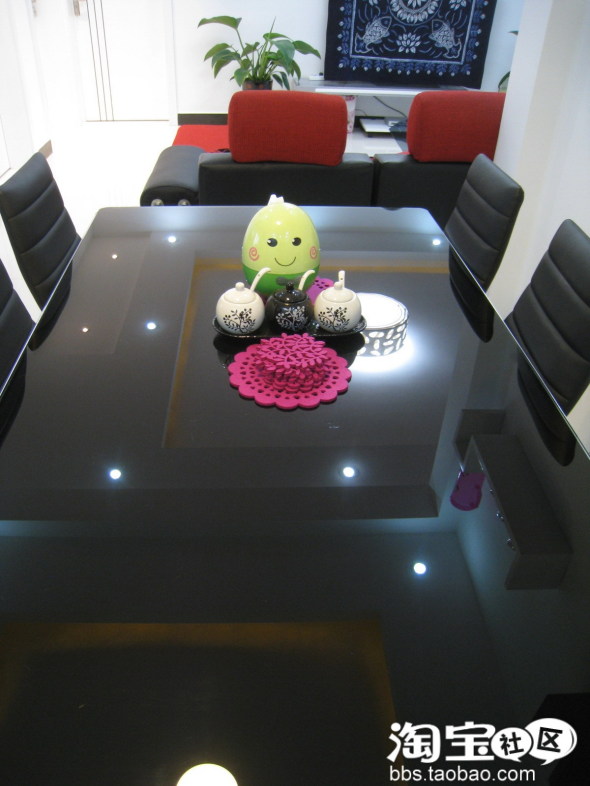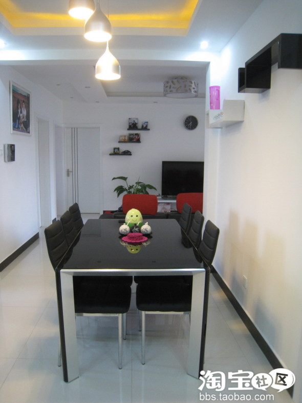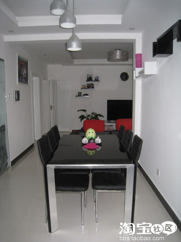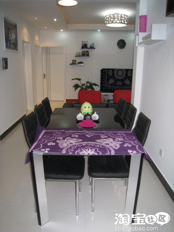 这个是我的饭厅的整体效果,一进门就可以看到饭厅到客厅一边的一个视野,灰色的吊灯在生活中淘来呢,用灰色做辅色调来搭配,黑色的餐桌是在网上淘到呢!150*90的尺寸,12cm的钢化烤漆玻璃,桌子的四个柱子是银灰色,搭配起来看着很有质感呢哦!桌子是我看了很多天呢才淘到,在“贵宾房家居”这个网店http://item.taobao.com/item.htm?id=2325341634店主是容ry忆