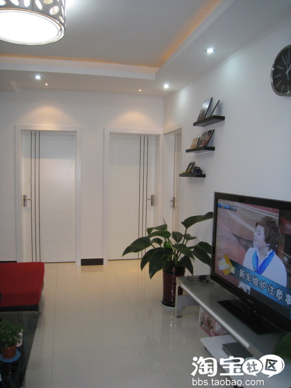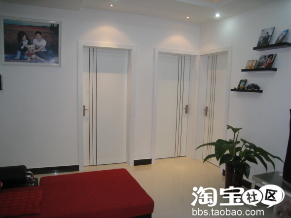 3、我的客厅简简单单的色调·~同一颜色的门,红色的暖色系列的沙发给客厅的黑白色来台点色调·~~也别有一份滋味。