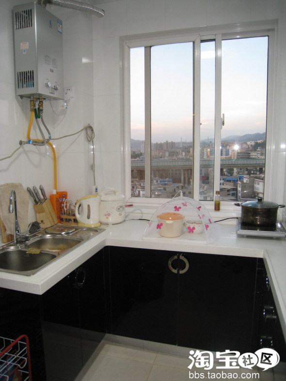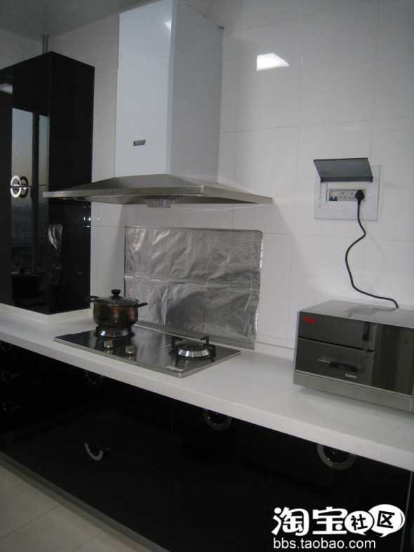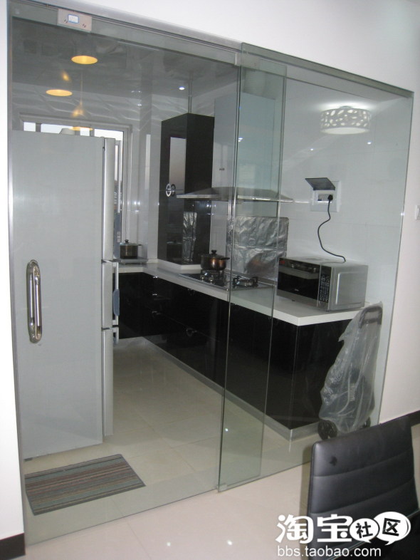 厨房我采用了黑色的烤漆橱柜,是我很喜欢的一个地方!哈哈·玻璃的门,给一种视觉上的感观效果,采光也很好呢·~