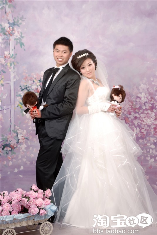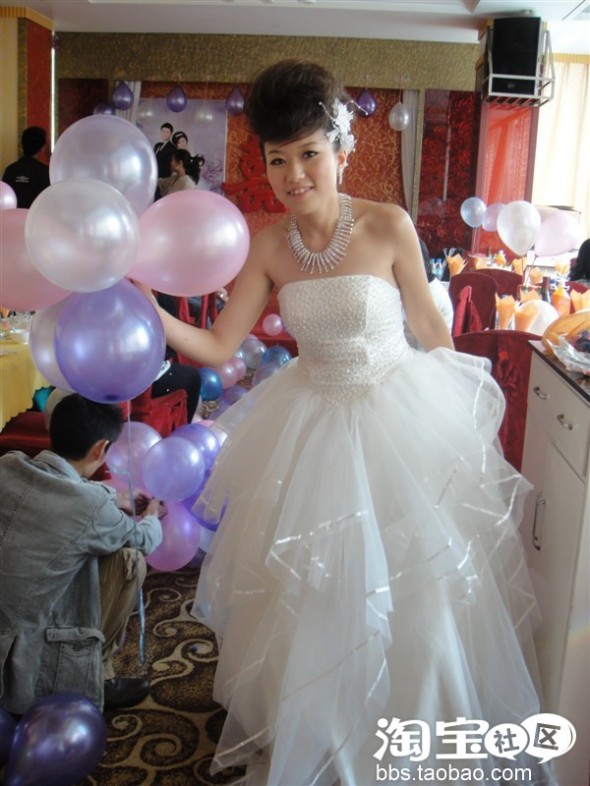 这个就是网购来的婚纱啦·~~是不是很棒啊·看着就不像是198元的呢!嘿嘿 头上的装饰白色的花也是网购来呢·