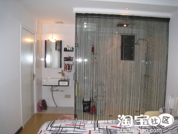 很喜欢我主卧的卫生间,全玻璃的把卫生间隔出来呢·~简单色调的搭配!旁边的黑白色的卫浴柜是在网上淘到呢!也是在卫浴柜是在“爱家卫浴建材超市”这个网店购买呢,店主是爱家卫浴建材超市;遮挡主卫玻璃的水晶线帘也是网购而来!http://item.taobao.com/item.htm?id=3371902235店主好运水晶线帘,挂上做装饰很喜欢