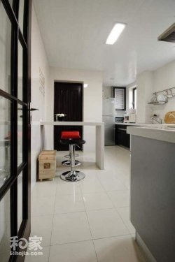 由于居家面积比较大,而且户型偏向于长形,所以很多区域的设计都偏向于长方形,这不就到了厨房,长形的设计,白色的色调。