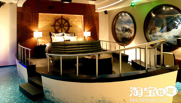 呵呵,大家一看就明白这是一船长生活为主题的卧室,或许你曾经是船长或许不是,想重温 一下曾经“涛声依旧”的生活吗?两边的窗户巧妙的用船上舷窗的形式代替,是原本单调的房间显得更加具有船的味道。枕头旁的舵轮在旁边的两盏灯的映衬下显得格外有驾驶室的味道,旁边的护拦也是仿造船上的,下面的台阶给你一种从驾驶室走下来的感觉。每当晚上狂风暴雨的时候,站在舷窗边眺望远方,仿佛自己曾经回到以前sea man的生活。重新拾起记忆的碎片。或是躺在床上看着外边。一句话惬意呀。