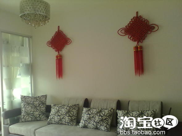 2、近看沙发,沙发的背景墙没做造型,就简单的挂了2个大中国结,让原本黑白的空间显得更有生气一点。这个客厅的水晶吊灯还不错,是我蛮喜欢的茶色水晶,显得比白色更高档!