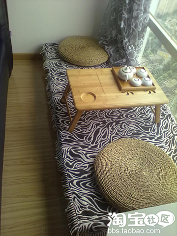 10、休闲区特写,其实就只是用板子做了个活动的(可以随时移动,以后不要这个了还可以搬走)榻榻米出来,上面的东西全是在朝天门淘到的,价格都还是比较实惠,这套土陶的茶具100块钱,呵呵,我还比较喜欢。我和老公走了很久都没看见有那种在榻榻米上放的实木小桌子,没办法,就只有买个床上用的电脑桌将就用了,呵呵,咋一看还不错,以为和茶具一套的呢!