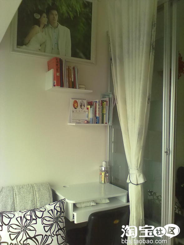 4、书房的电脑桌,书架设计的简单,就直接是2张隔板,我就嫌它短了一点,其他都还好,这个桌椅是我淘了很久才买到的,之前有一模一样的,但是价格却贵死人,这个还买的合适,100块钱,坐起来挺舒服的!
