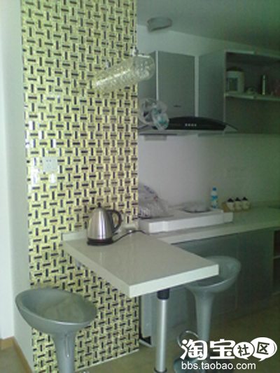 6、由于厨房小,因此我做成了开放式厨房,与客厅的隔断就做了个吧台,平时就我和老公在家的时候就在这吧台上吃饭,还挺温馨的,呵呵,灯光是那种昏黄昏黄的颜色,正符合吧台上吃饭的气氛。
