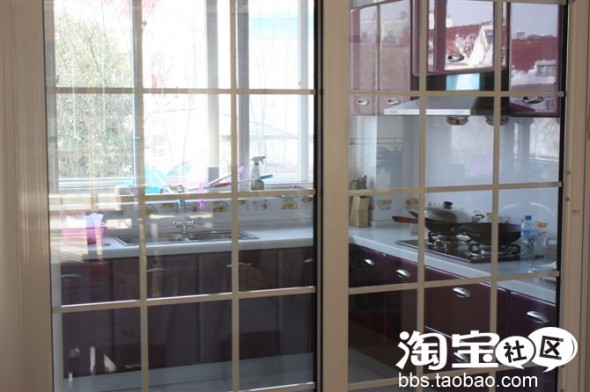 从餐厅往厨房看,餐厅到厨房本来就一扇门,我给打成了两扇,做成推拉门,这样感觉是不是很好呢!橱柜的颜色是我喜欢的,是不是发现我的厨房比较大呢,我就喜欢大厨房