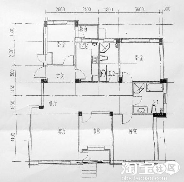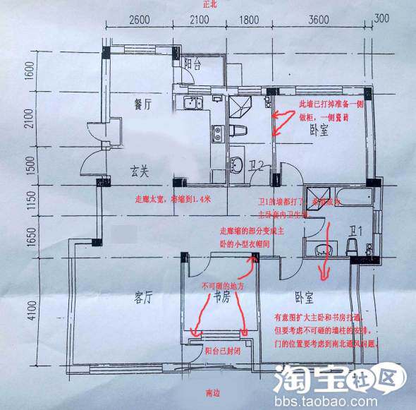 我现在准备装修这套房子,但是这边的设计师给的设计总是不能照顾到全部要求。只好上网来求助。我也不敢奢望设计图或者效果图,哪怕有专家,有经验的淘友们给点建议我就非常开心了。投一次装修,一头雾水,还不想凑合,毕竟是毕生积蓄啊!下面有原本的平面图(相机拍的,对不住了)还有写红字的是我的期待。。。希望能得到满足。介绍:房子南北向,南边阳台已封闭(北方冬天太冷),全明!采光极好。除了图纸上黑色为支撑柱承重,以及标注的阳台封闭部分结构不可砸,其他的随便改都可以。得房率很高。本层无花园,请忽略原始图南面的小楼梯。简述要求如下: 1.希望大卫生间能成为主卧的从属卫生间,不近主卧也就进不了这个卫生间。 2.走廊太宽,想把书房和主卧延出来,或者接出个主卧的衣帽间。 3.有把书房和主卧的墙打通的欲望,不过还在论证,因为房间中会有一个承重的柱子,并且阳台那边的墙不能全打通,合格也不一定挡什么,就看怎么设计规划了。不过本条并非最重要的哈。 4.如果3可以行得通,那么进主卧的门开在哪里?要考虑到穿堂风(南北通风)问题。如果从书房部分进来,是否可以在现在主卧的位置墙上开窗和北边卧室的门形成通风?请大家留下建议!太感谢了!我现在一个头两个大。做梦都在摆积木。。。。8楼 chenchen311 说:
