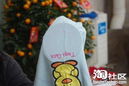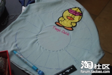 第五步:开始缝刚刚画的太阳,记住,不要缝大圆的边,仅仅缝刚刚画的小边。(即上图红色注明的边缝上就OK了)