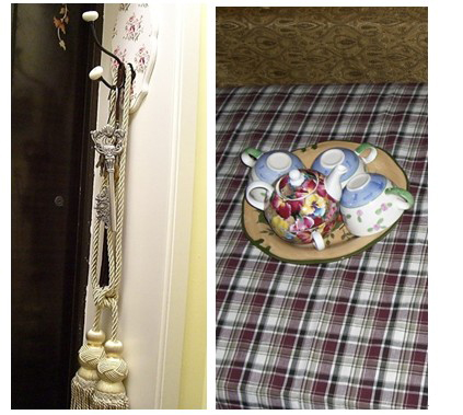 这个白色的小柜子是我团购来的,巨便宜啊!像童话里那种吧~!上面的茶具和小画也是我淘来的~!