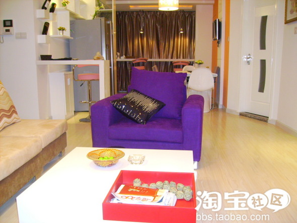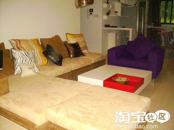 全部沙发都是购于淘宝,单人沙发是紫色的,实物更漂亮,光线不好的缘故。是我的大爱,茶几也是购于淘宝,还有沙发上的亮色抱枕也是购于淘宝和桌旗一起购买的。