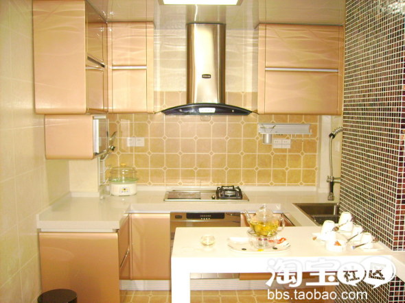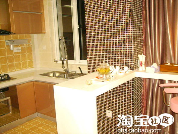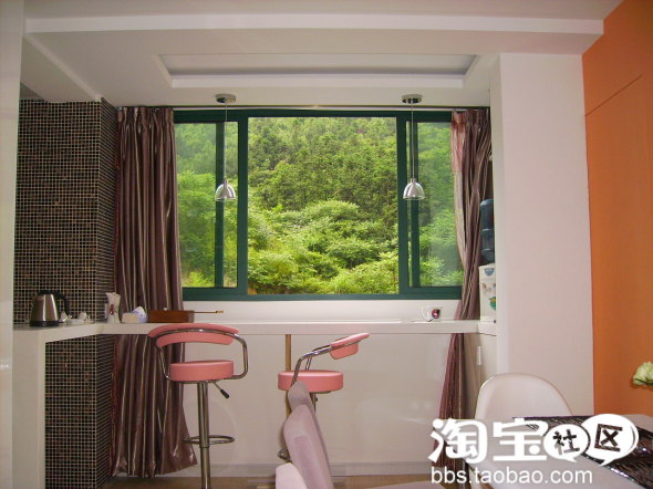 厨房是开放式的,做了现在最流行的面包型的橱柜,搞卫生的钟点工都不知道怎么开门,哈哈。厨房所有电器都购于淘宝,哈哈。还有后阳台的吧台上的马赛克也是购于淘宝,真的是变淘宝达人的。哈哈,各类快递人员都要认识我的。。后阳台全部给我包进做了个长长的吧台,可以坐在这里看后山的美景。