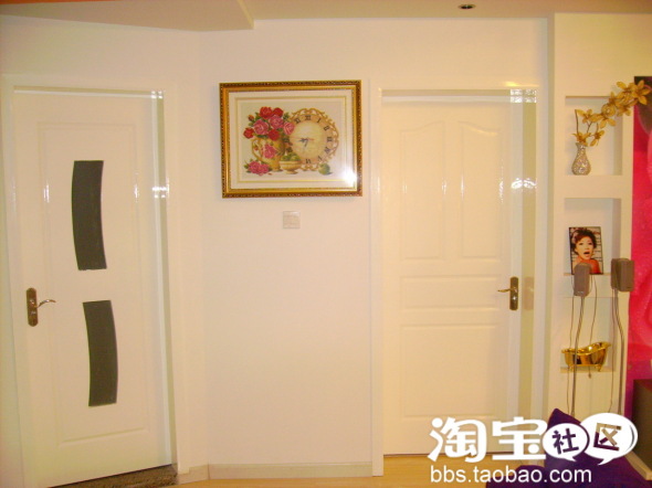 进门处看里面。墙上的十字绣带时间的,是妈妈的处女绣。很漂亮把它放在最醒目的地方,所以门的把手也是购于淘宝。