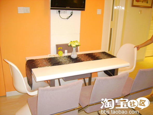 餐厅墙面用的是橙色,很大胆吧。后面有个隐形门,里面是走入式衣柜带储藏功能的。为了配合橙色的墙面餐桌找了很久,终于找到满意的,还有很实用,油水很容易擦掉的,据卖家说麦当劳用的就是这种材质的。潘冬椅和餐椅均来自淘宝,还有桌旗,请忽略照片中的女主人的手,哈哈。。。