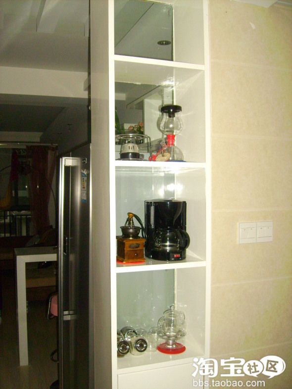 包括阳台的好太太也是杭州淘宝卖家,黑色的不锈钢垃圾桶,里面所有的光源,灯具,开关面板,还有最后为了超大冰箱特意做的柜子,里面的所有咖啡用具。花茶杯具都是来自于淘宝。各位兄弟姐妹要淘宝网址的和我联系。我家几乎是百分之百的来自淘宝,真的是淘宝之家。