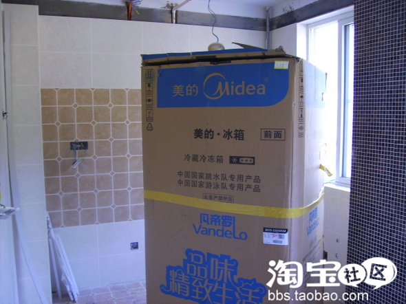 贴完瓷砖的厨房。还好把冰箱提前在装修阶段时买好并搬进家里,这个冰箱实在是太大了,等房子装修完了真不知道怎么搬进来,庆幸啊。。。。请兄弟姐妹们切记买大冰箱一定要提前。