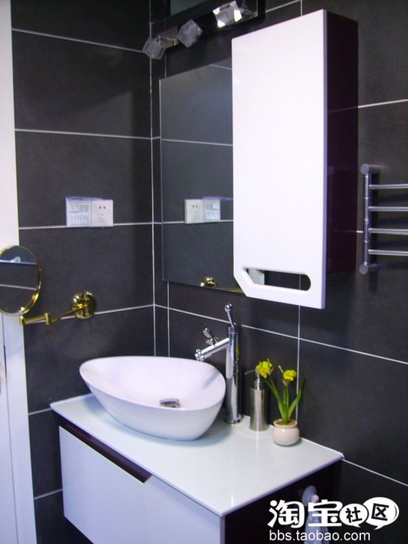 次卫是用黑灰白的。我觉得颜色不够眺,所以用了黄色的浴室柜。也是购于淘宝的,还有里面的所有的卫浴,包括装饰马赛克也是购于淘宝。还有这个美的性价比最高的电热水器,7分钟出热水,带遥控的,来自山东的卖家。绝对的行货,到杭州由美的公司来安装的。