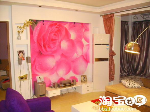 这是客厅,墙上的壁纸是没装修前就一眼看中的,所以很多都是以这个为中心来搭配颜色的。这个墙纸和装饰品都购于淘宝。