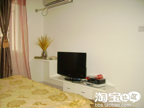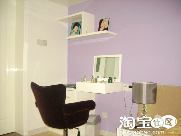 卧室用了淡淡的紫色。床和床品,席梦思,还有深紫色化妆椅都是购于淘宝。卧室电视机也是购于淘宝。